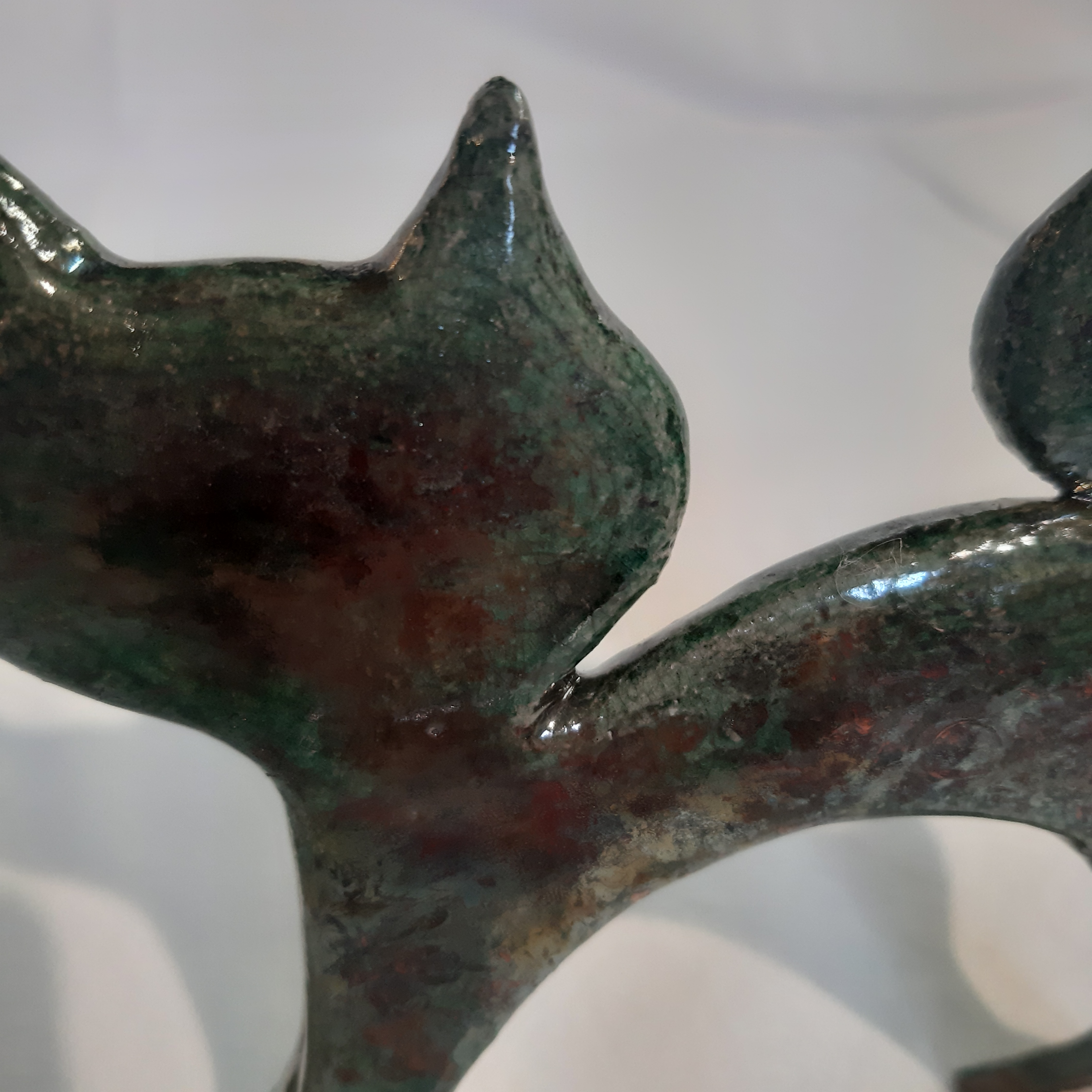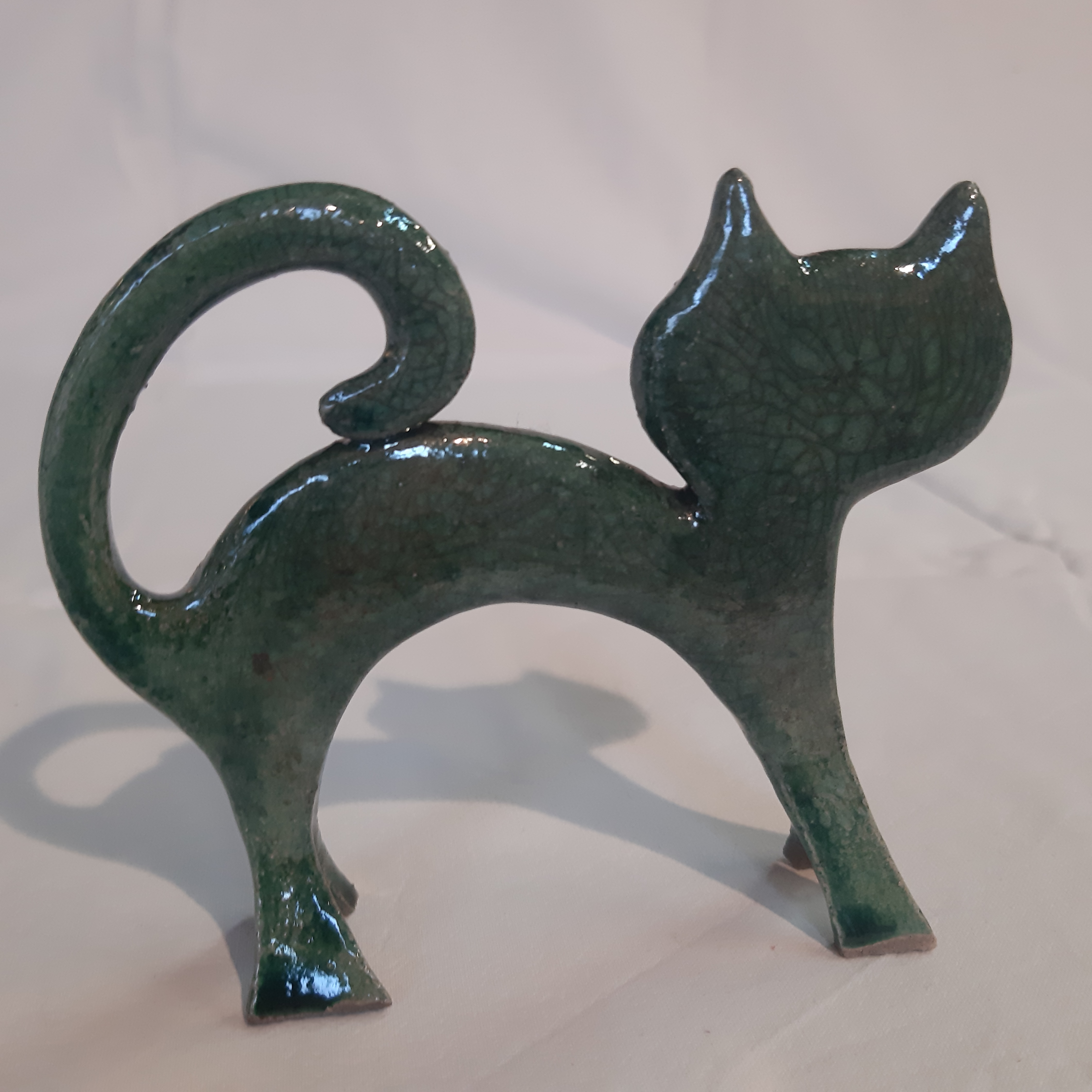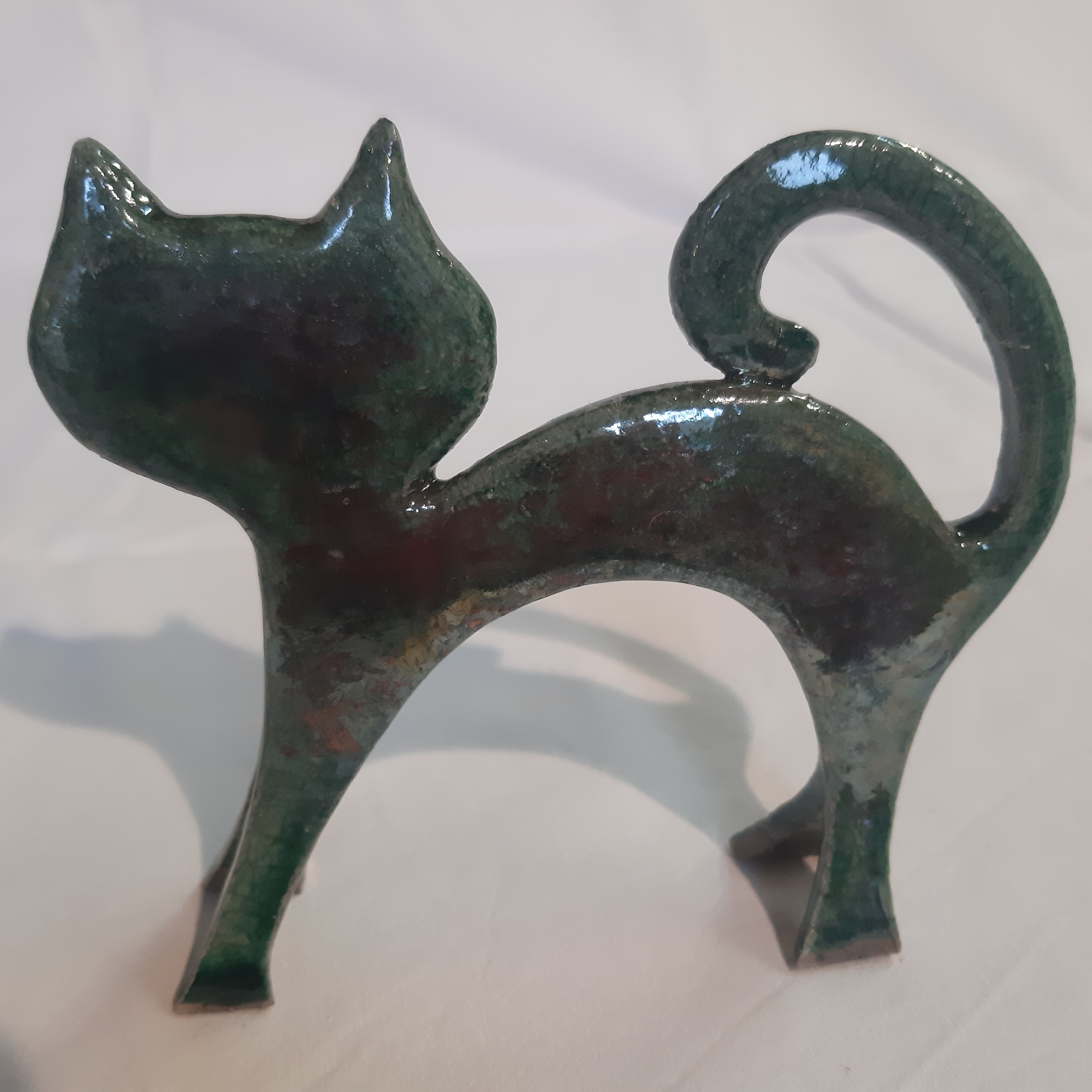 Chat modelé épuré cuisson réalisée selon la technique du raku, belles craquelures et métallisation rouge de cuivre sur une face