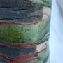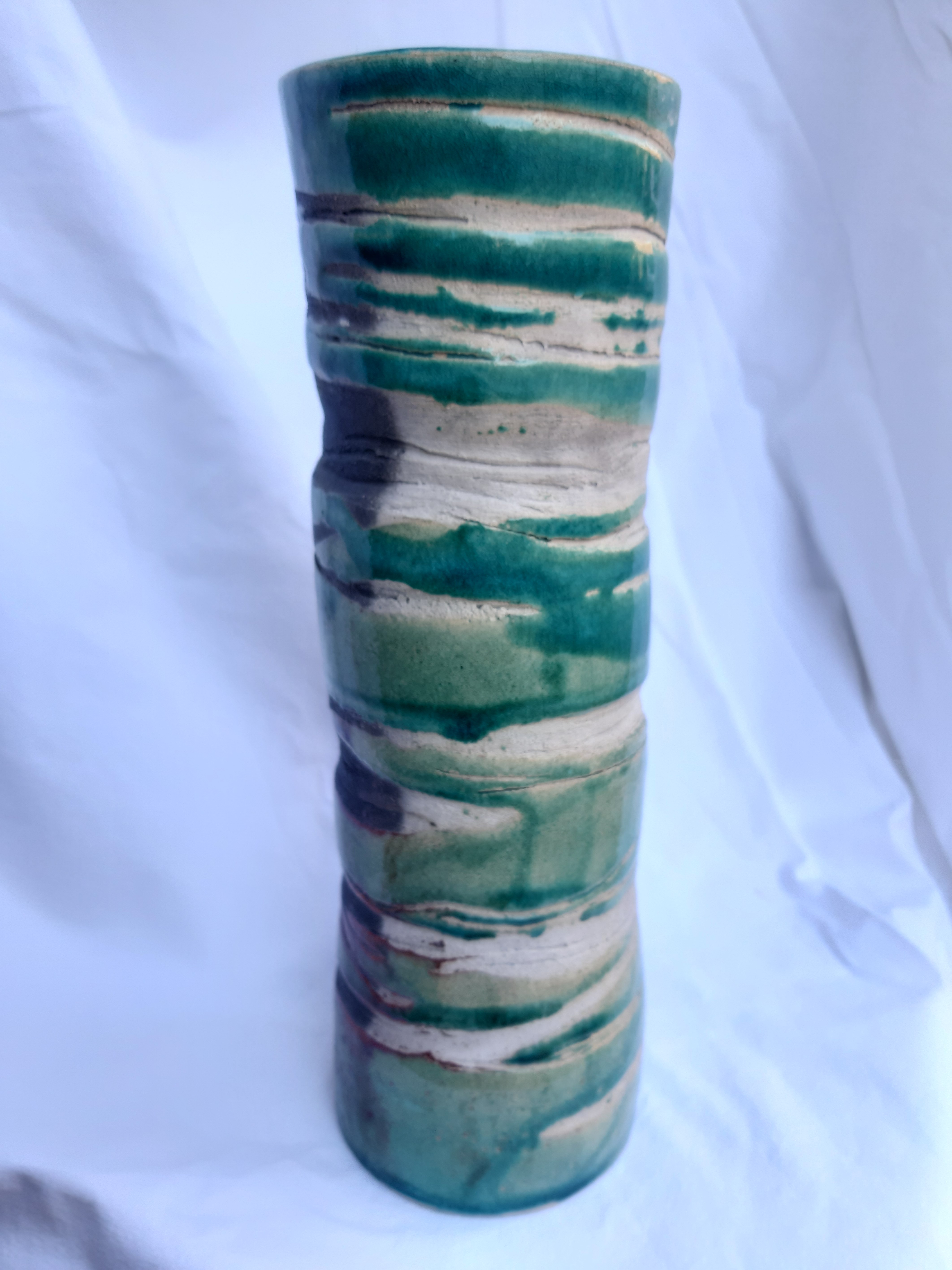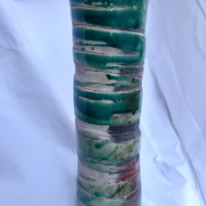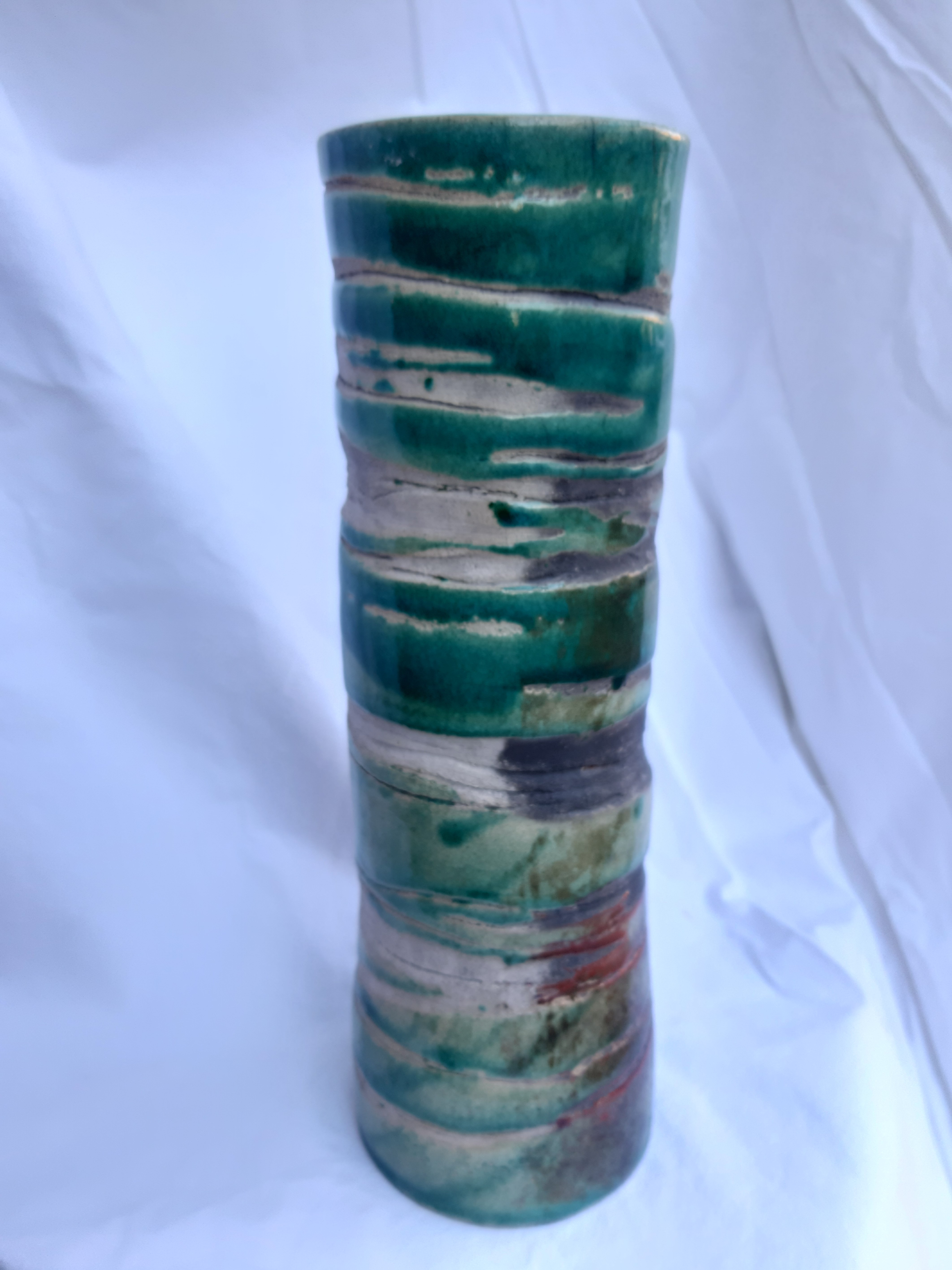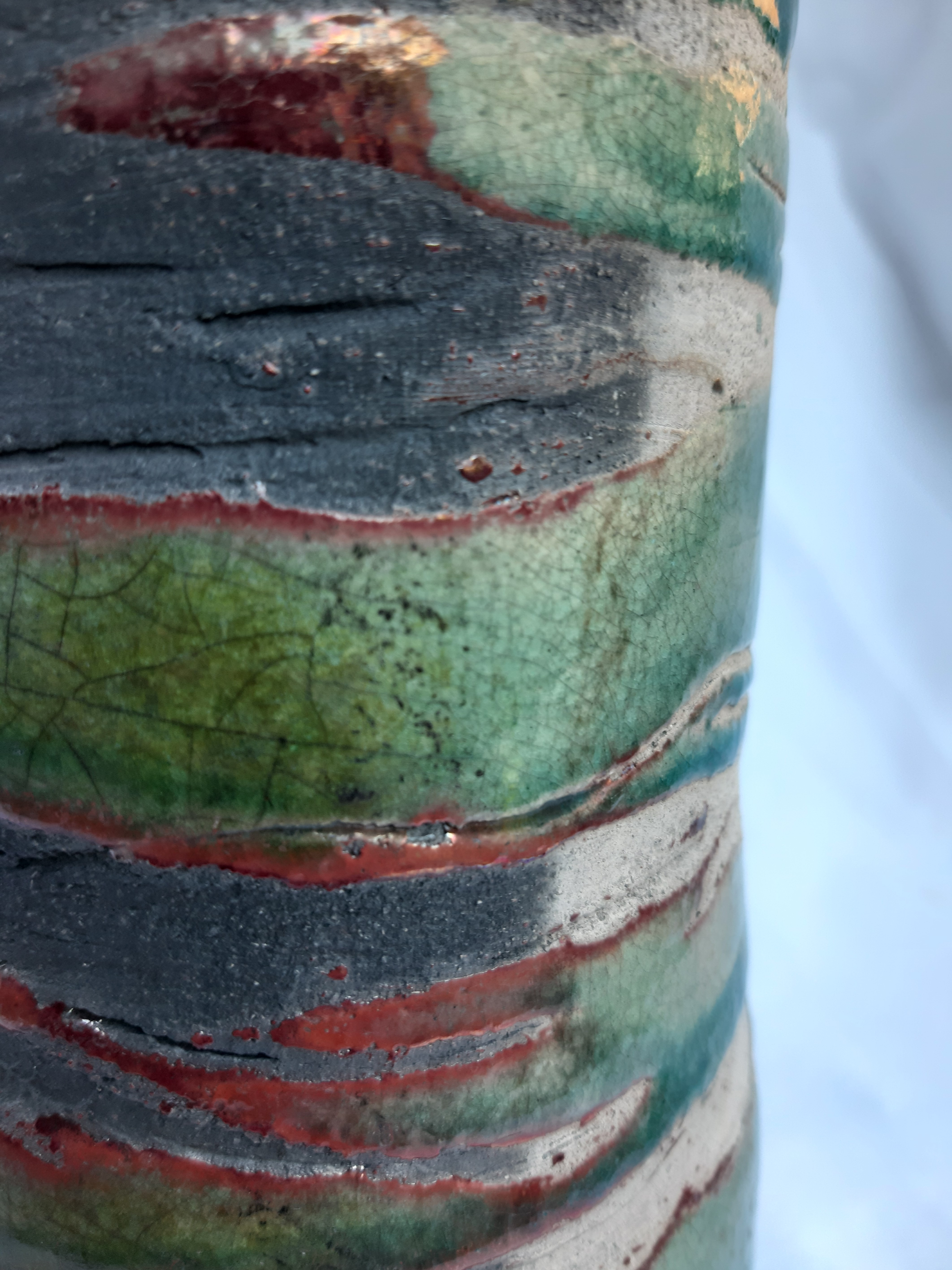 Grand vase cuisson selon la technique du raku offrant toute cette palette de couleurs turquoise, moiré, rouge de cuivre. nuances grisâtre à noire pour les parties non émaillées. Magnifiques contrastes